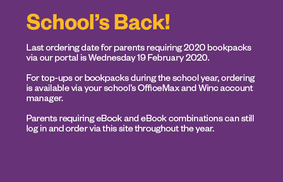 With the school year underway, the last ordering date for parents requiring a 2020 bookpack via officemaxschools.com.au is Wednesday 19 February 2020. For any later ordering requests, your school is able to send requirements via your OfficeMax-Winc account manager.